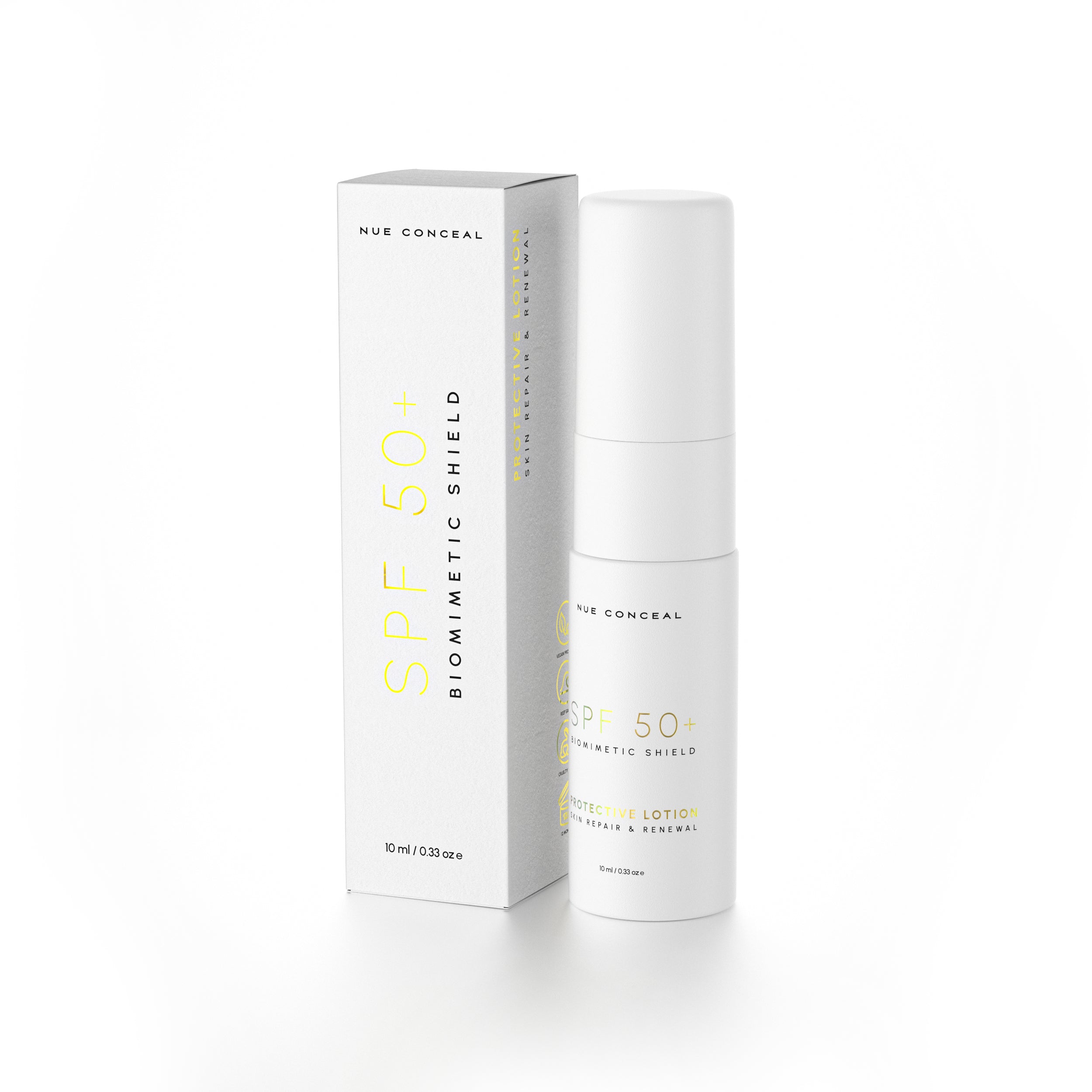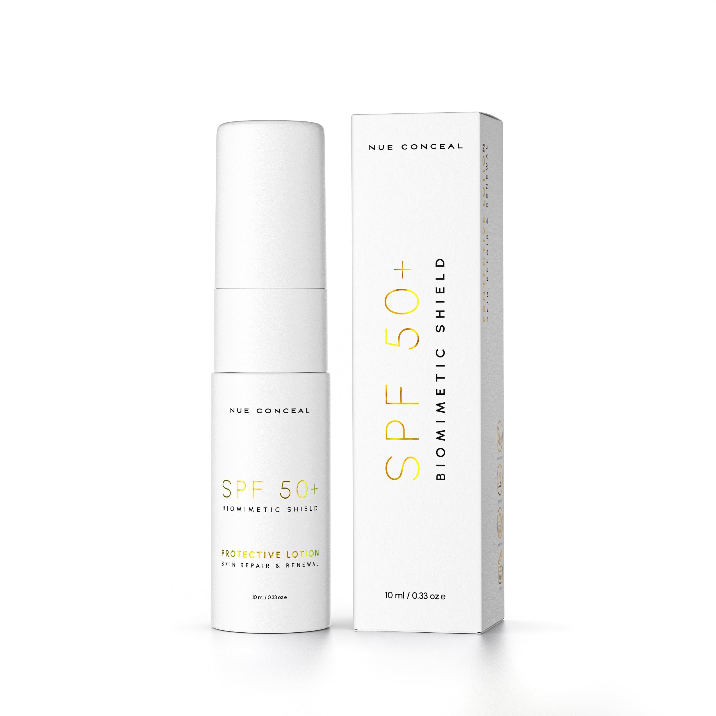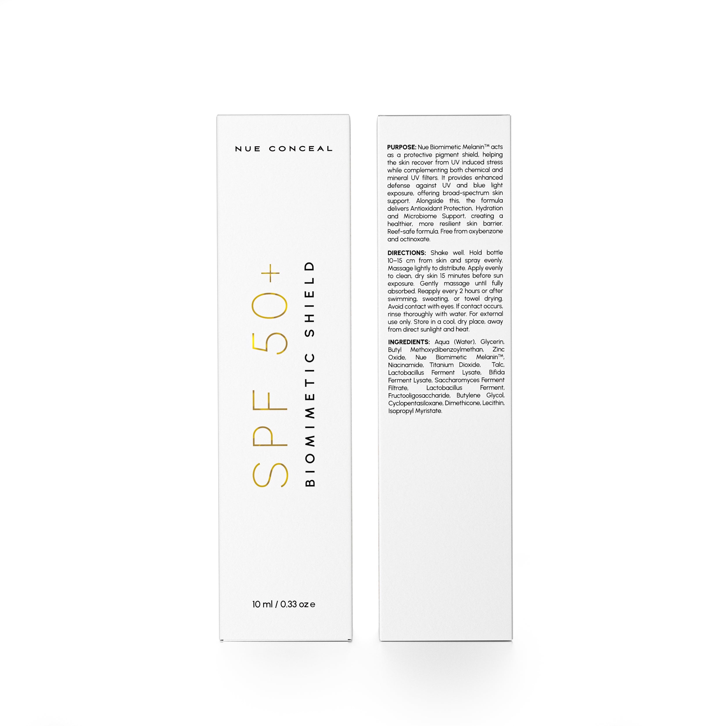 Description: SPF 50+ Biomimetic Shield is a daily protective lotion formulated to defend the skin against UV-induced stress while supporting barrier recovery and skin resilience. Designed for post-procedure care and everyday use, it combines broad spectrum UV filters with biomimetic and microbiome-supporting ingredients to protect, hydrate, and reinforce the skin. Powered by Nue Biomimetic Melanin™, this formula acts as a protective pigment-inspired shield, helping the skin recover from environmental exposure while supporting a more balanced, resilient barrier. Antioxidants, hydrating agents, and ferment-derived ingredients work together to support skin repair, hydration, and microbiome balance without heaviness or irritation. Lightweight, fast-absorbing, and non-greasy, SPF 50+ Biomimetic Shield is suitable for use after aesthetic treatments and as part of a daily skincare routine. Reef-safe and free from oxybenzone and octinoxate.